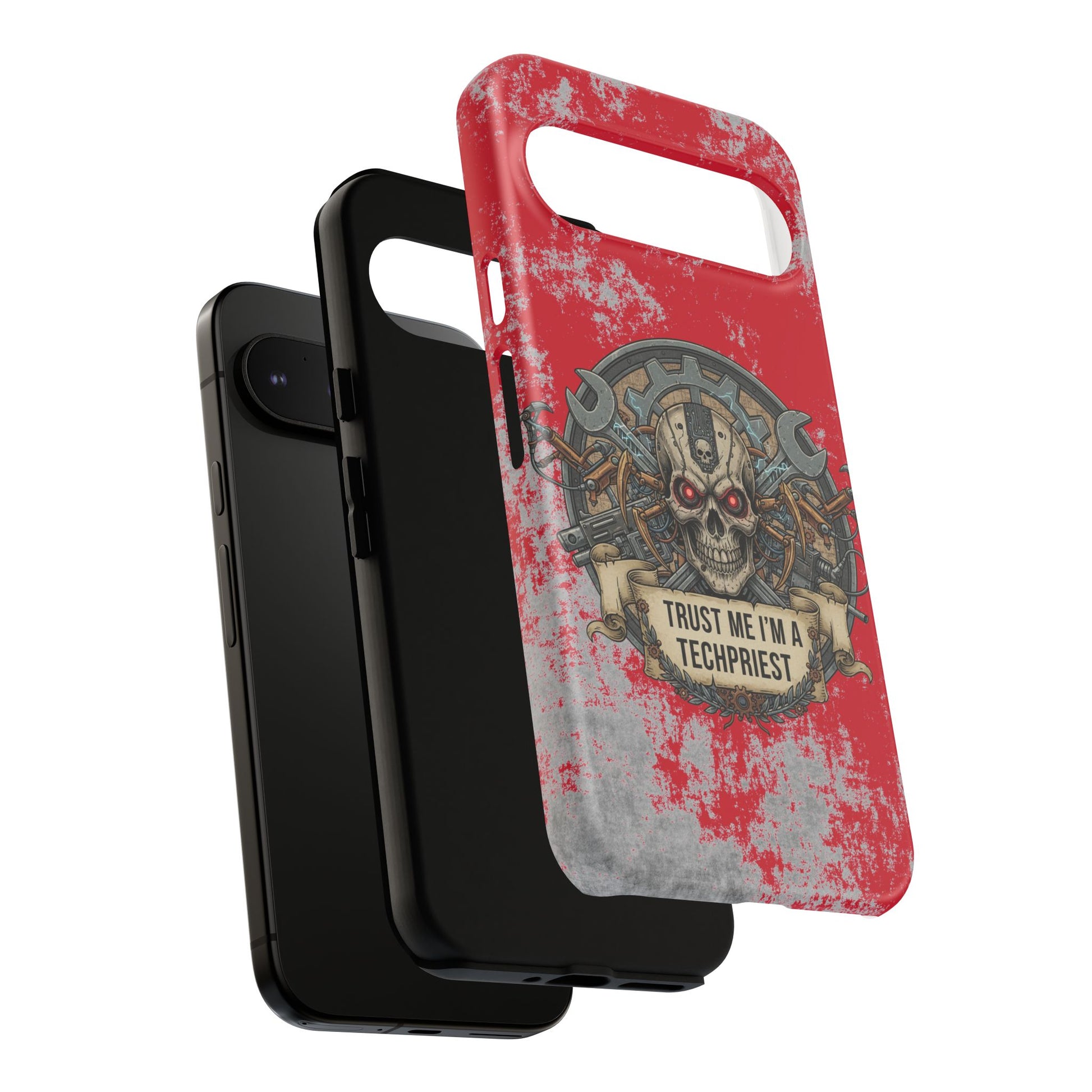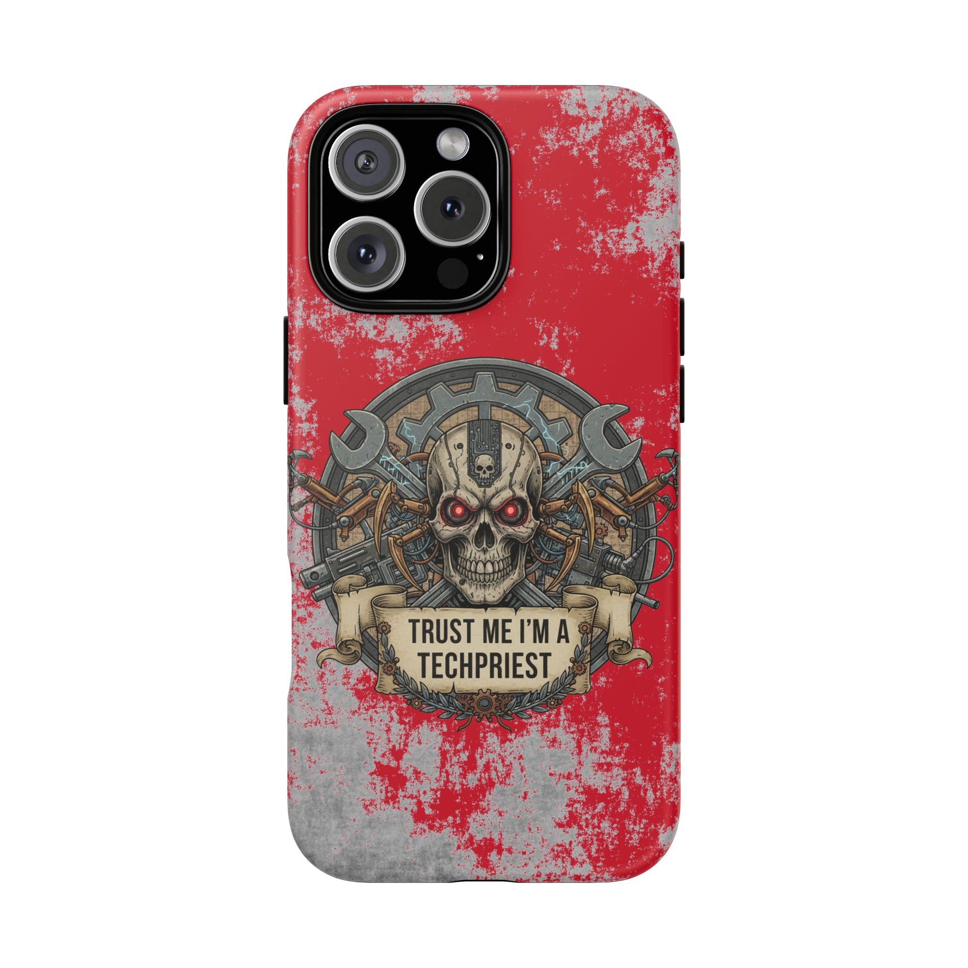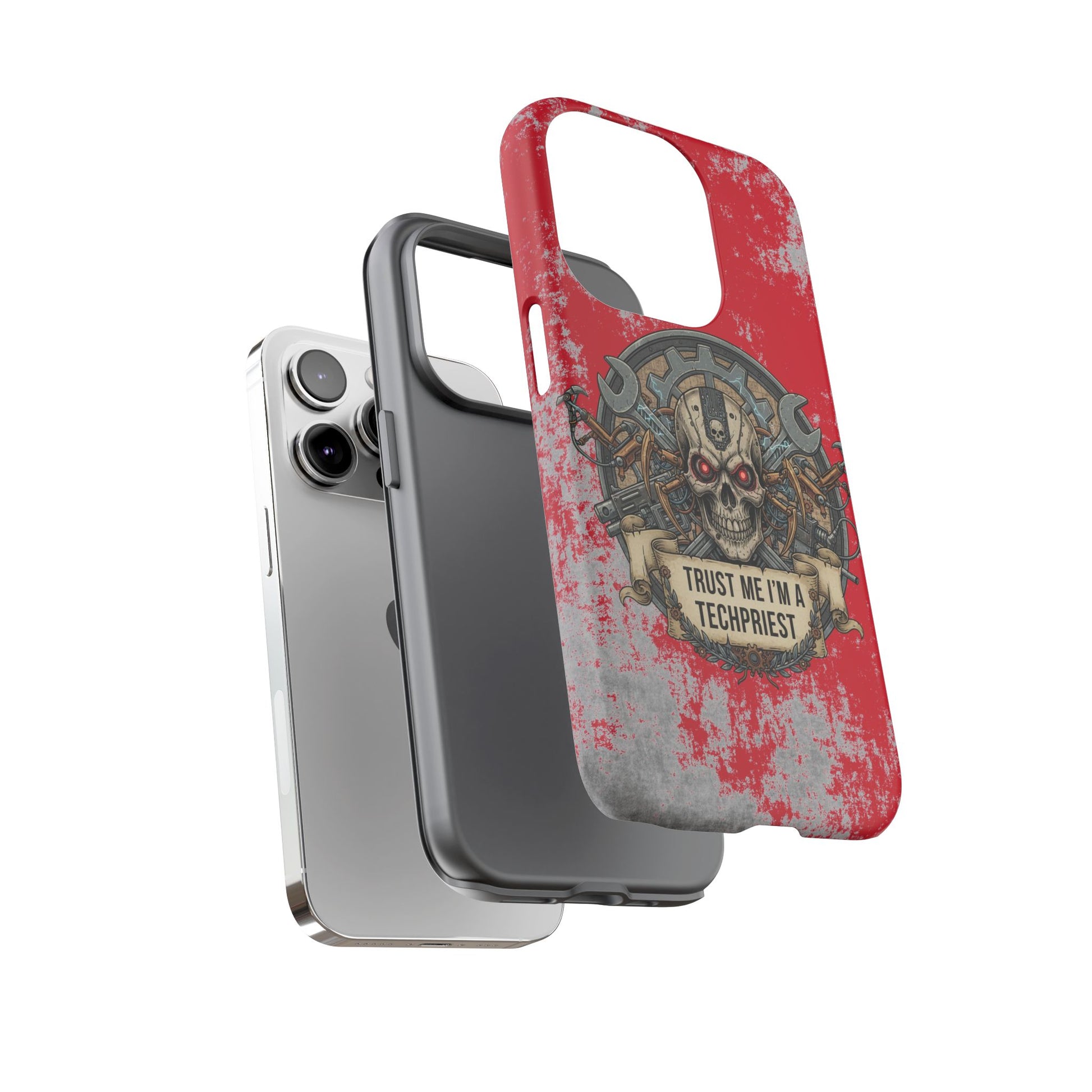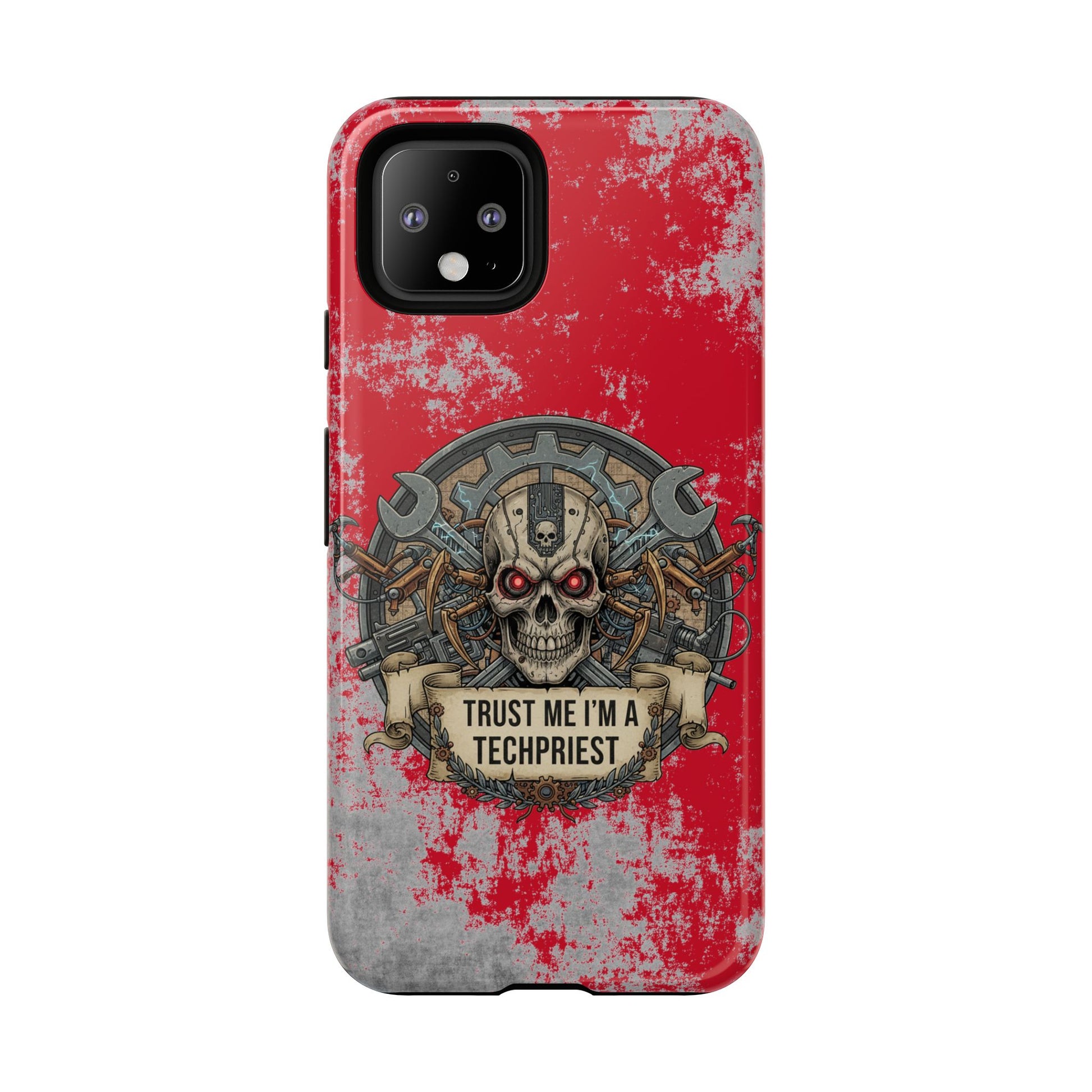 A funny and grimdark phone case featuring a 'Trust me I'm a techpriest' design, perfect for wargamers. This durable and impact-resistant phone case provides excellent shock absorption and protection against drops and tears. Ideal for adults who enjoy wargaming and want to showcase their unique sense of humor. Perfect for gifting on birthdays, holidays, and special occasions.