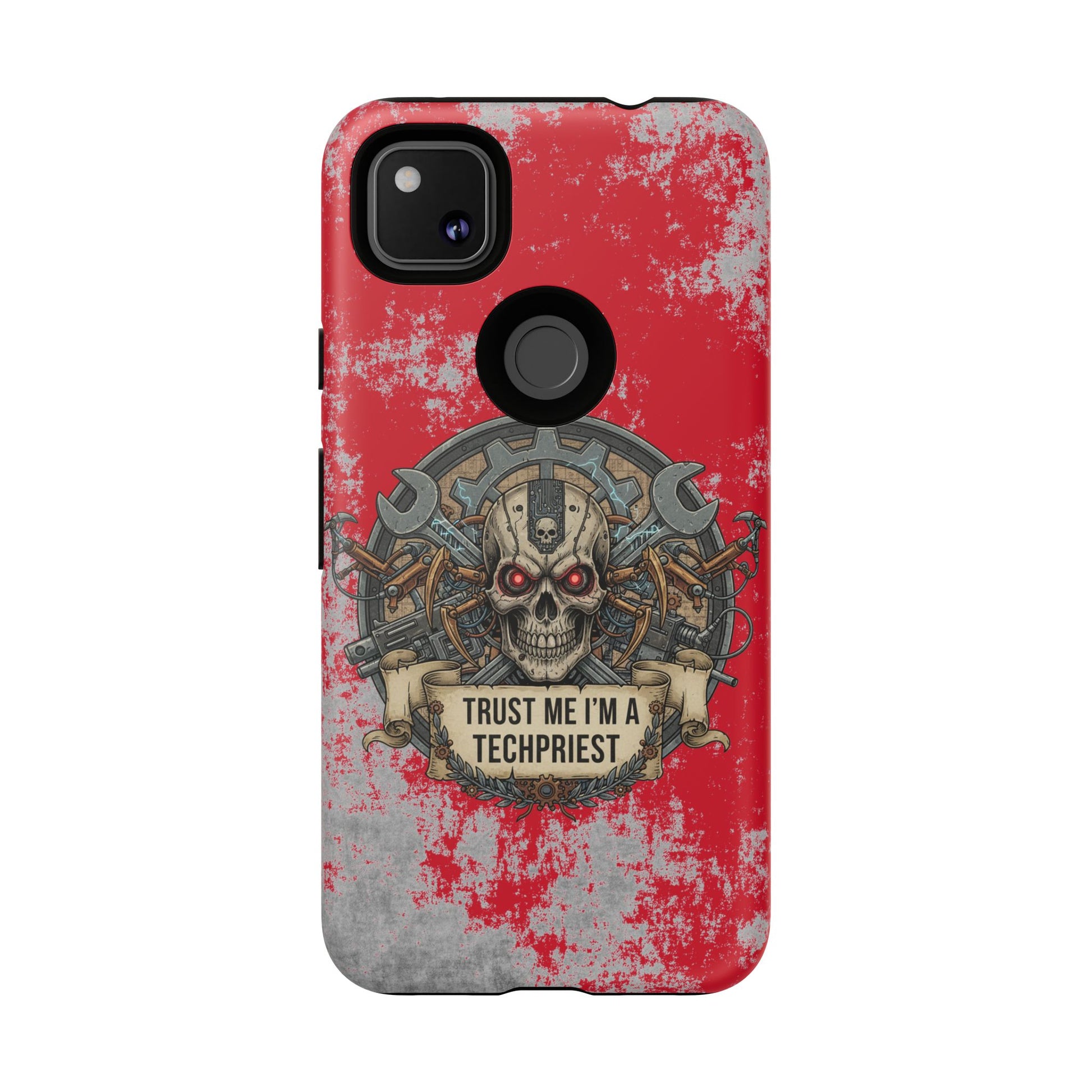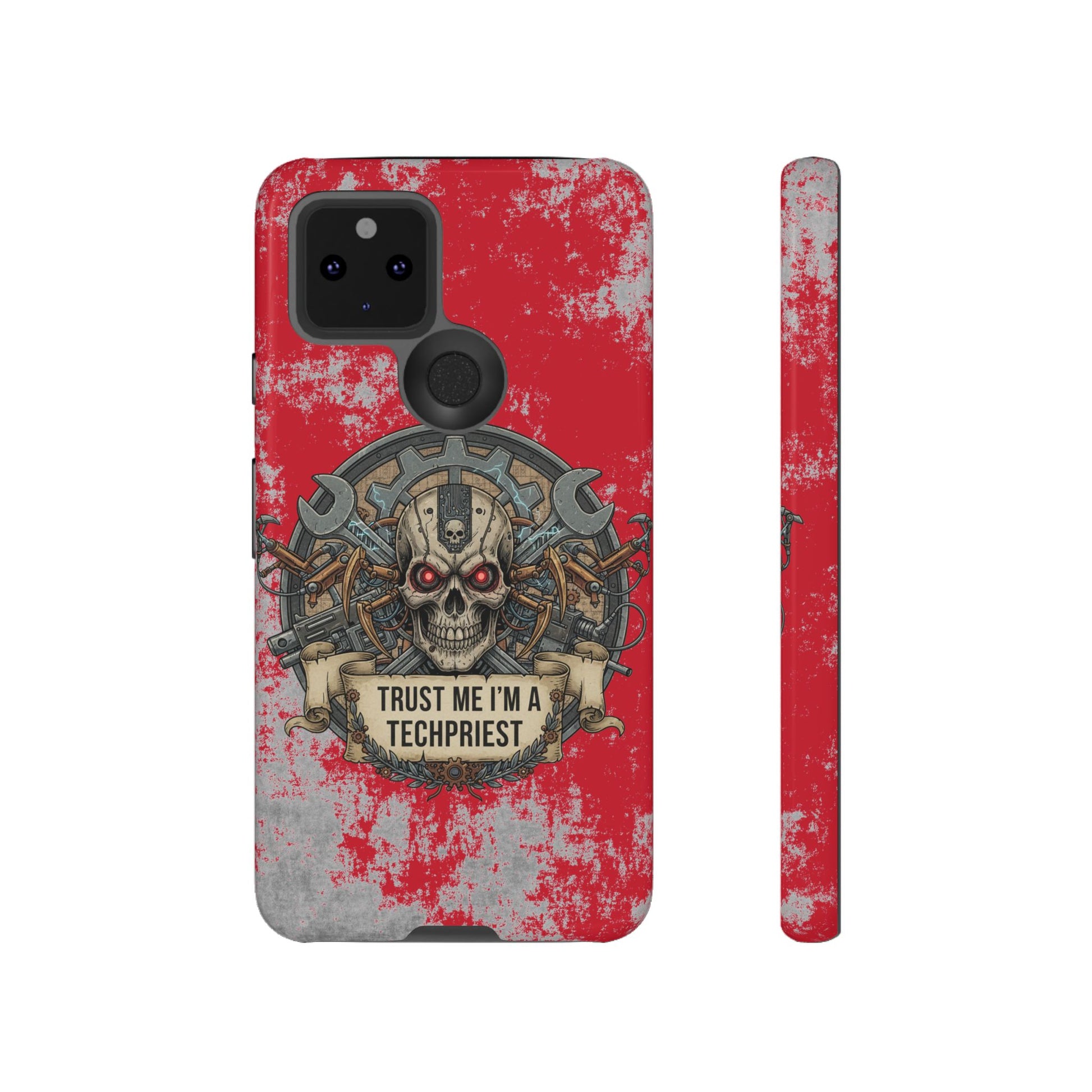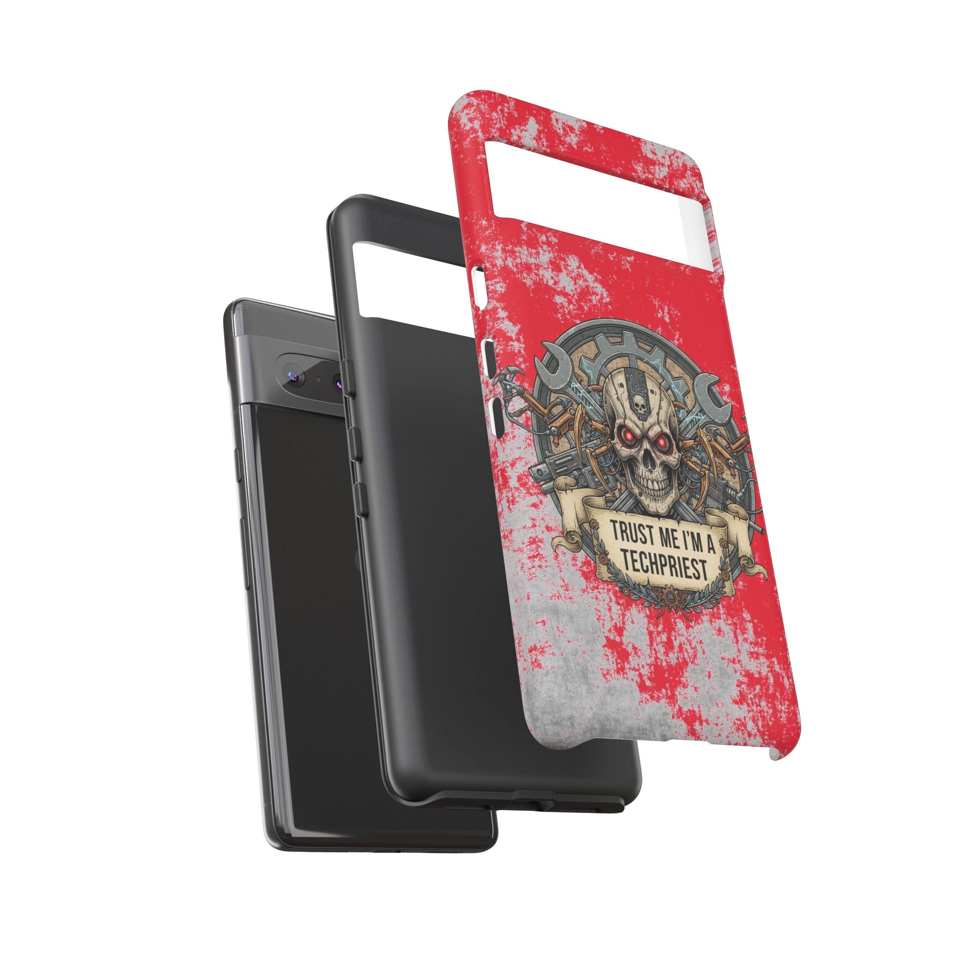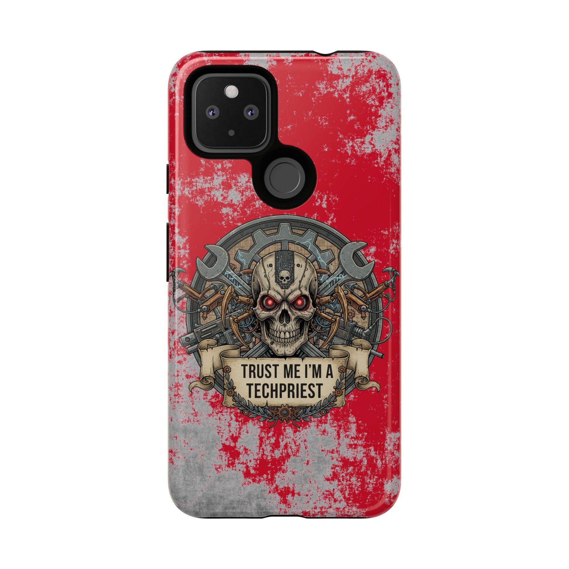 A funny and grimdark phone case featuring a 'Trust me I'm a techpriest' design, perfect for wargamers. This durable and impact-resistant phone case provides excellent shock absorption and protection against drops and tears. Ideal for adults who enjoy wargaming and want to showcase their unique sense of humor. Perfect for gifting on birthdays, holidays, and special occasions.