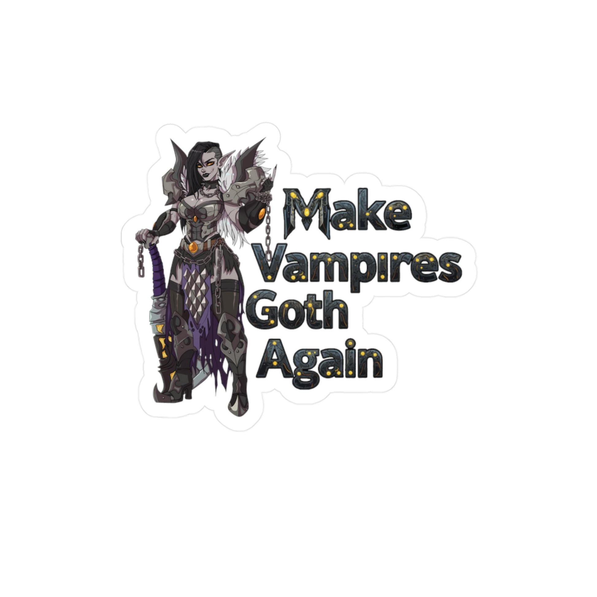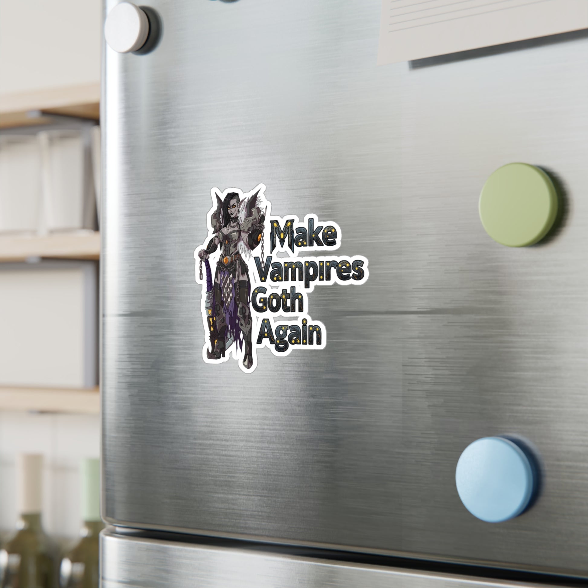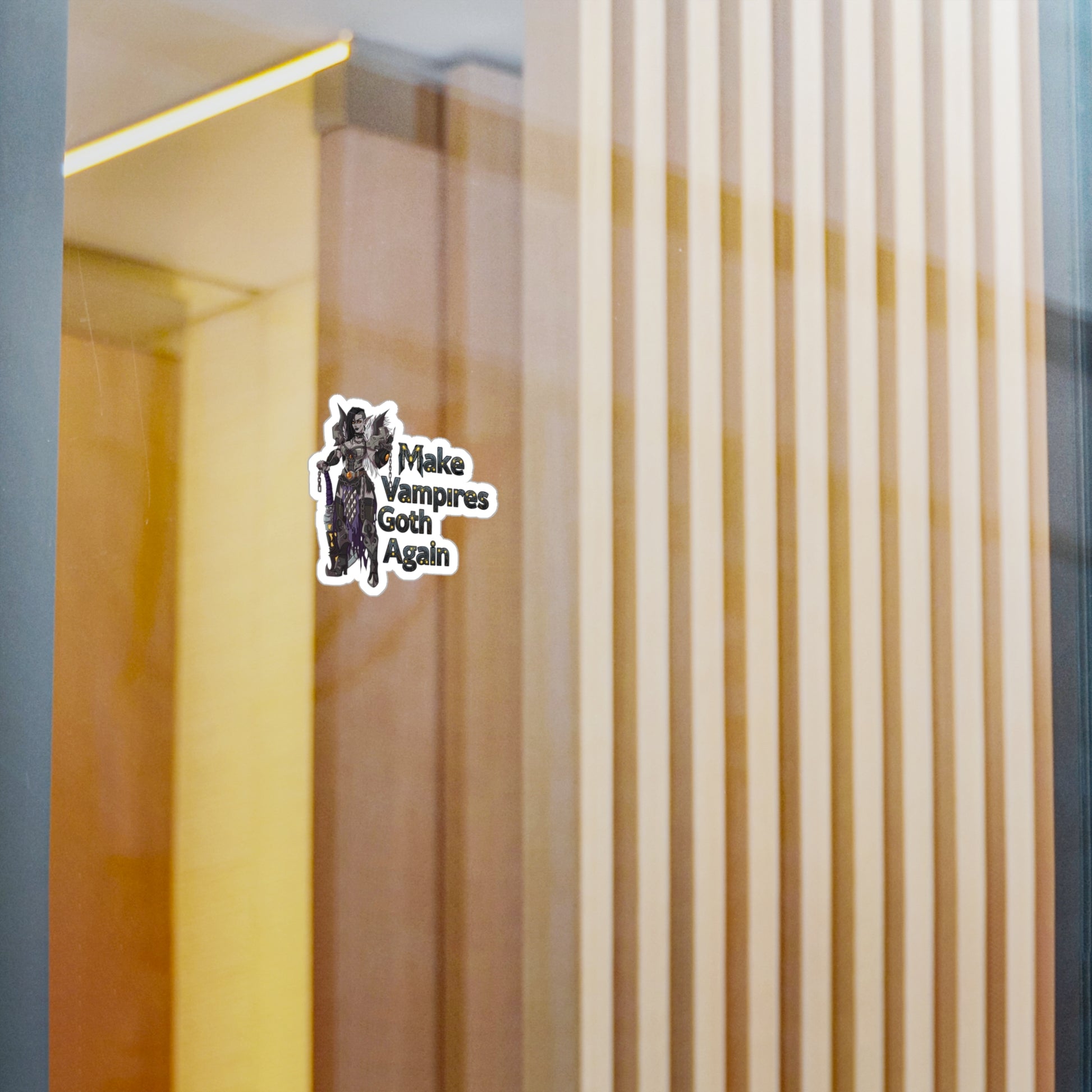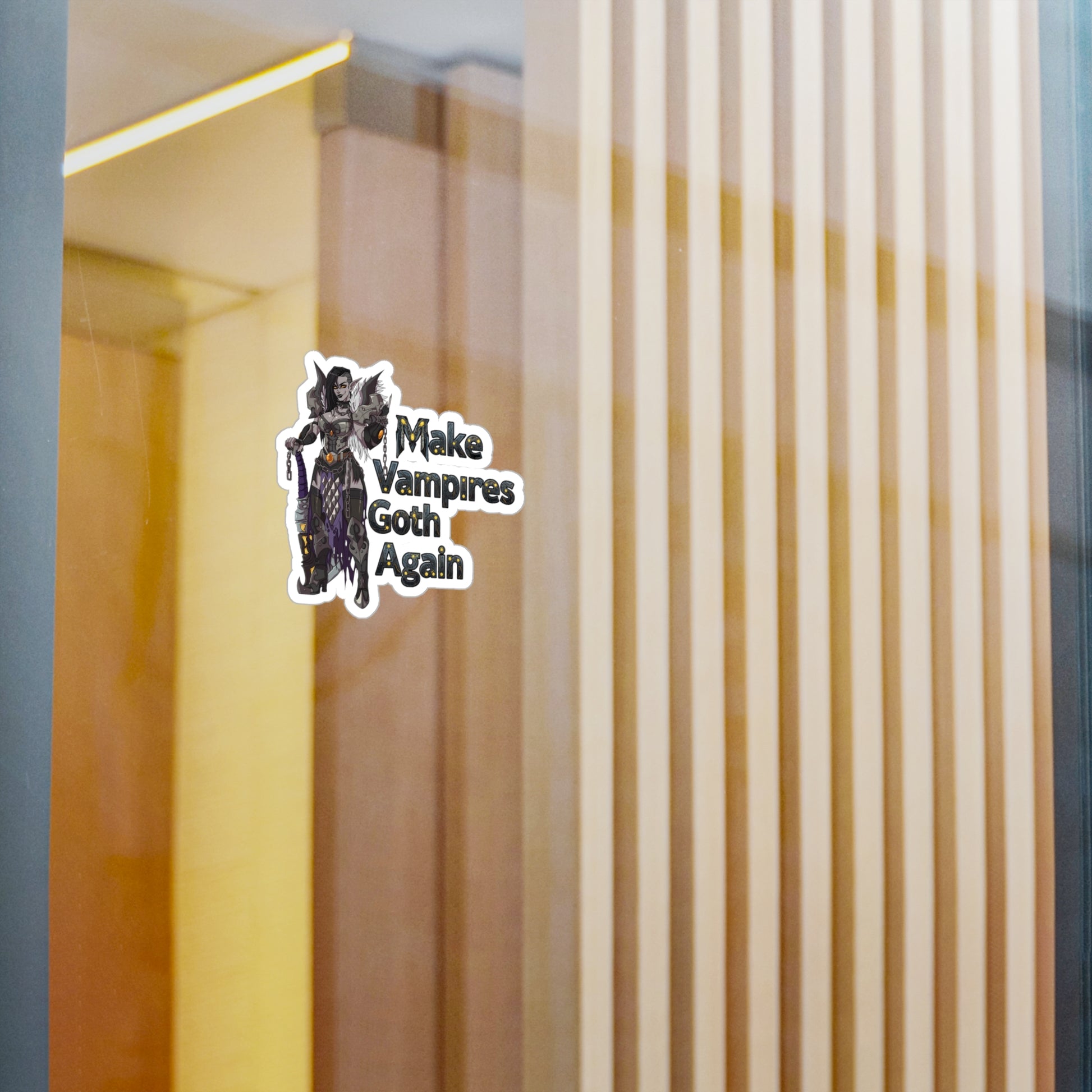 Vinyl decal saying make vampires goth again for fans of void elves. Perfect for those who love dark and gothic designs, this decal can be placed on laptops, water bottles, notebooks, and more. Ideal for Halloween, goth-themed events, or just adding a touch of darkness to everyday life.